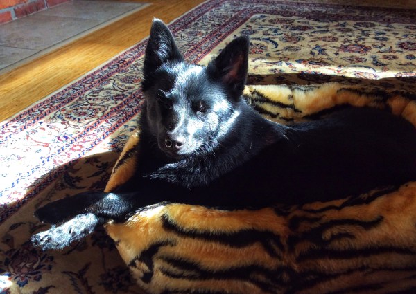 This Friday, Ruby and I went back into the show ring; our first since getting her championship in October 2016. We braved car breakdowns, snowstorms, and sleepless nights. She looked fabulous and performed brilliantly. Here she is, relaxing like Cleopatra on her handmade tiger bed.