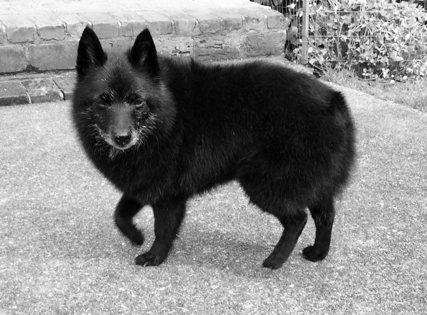 The grey mask spills across her muzzle,