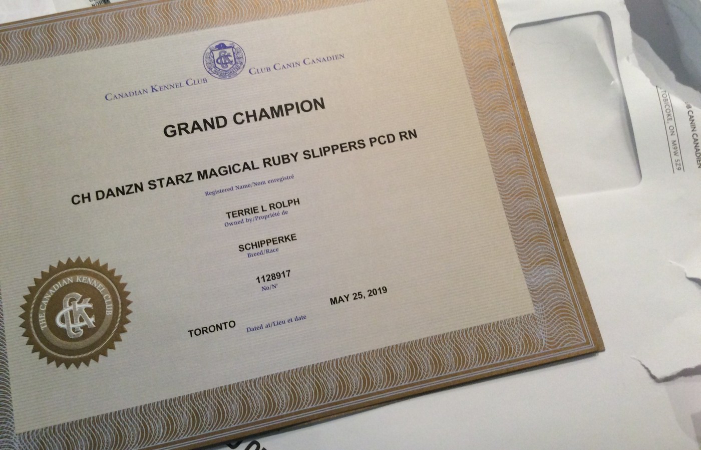 Today, the Canadian Kennel Club’ letter of congratulations and our Grand Championship Certificate arrived in the mail.