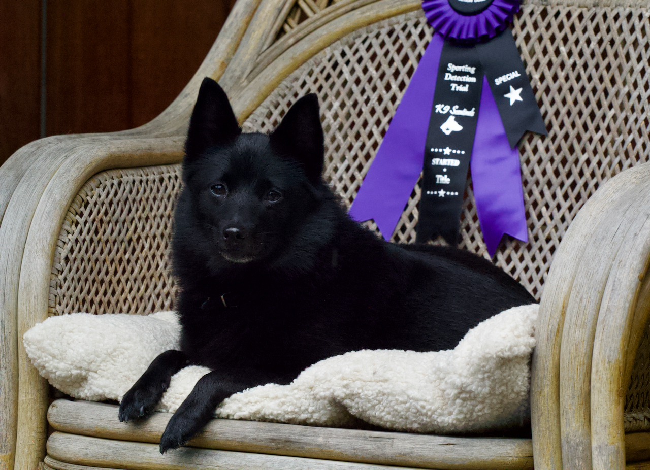 Pleased and proud of my inimitable Ruby, who today, earned her SDDA Starters title, finding hides in containers, interior and exterior searches.